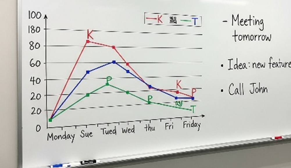 「このホワイトボードの画像を解析してください。タイトルを読み取ってください。グラフの傾向を読み取り、Keep(赤)、Problem(青)、Try(緑)が1週間でどのように推移したか、分析コメントを書いてください。このグラフの数値を推測し、CSV形式で出力してください。」