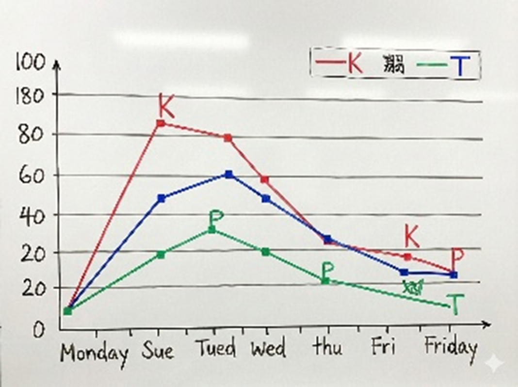 X軸の手書き文字に一部誤字(Sue, Tuedなど)が見られますが、月曜日からの1週間の推移として解析しました。