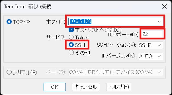 TeraTermを起動すると接続先を指定する画面が表示されますので[ホスト]に前回インストールしたAlmaLinuxのIPアドレス「10.9.8.100」を入力します。その他の設定は下のキャプチャ画面と同様にしてください。