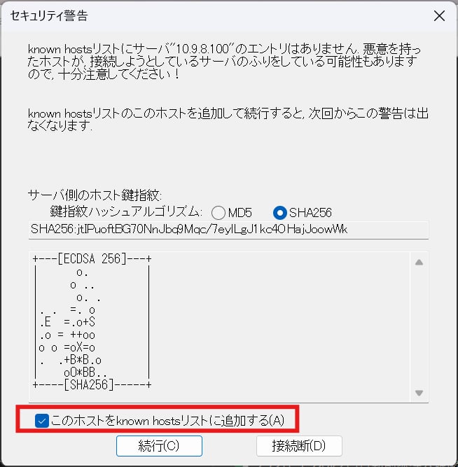 初回接続時は下記のような警告がでます。[このホストをknown hostsリストに追加する]をチェックして[続行]ボタンをクリックします。