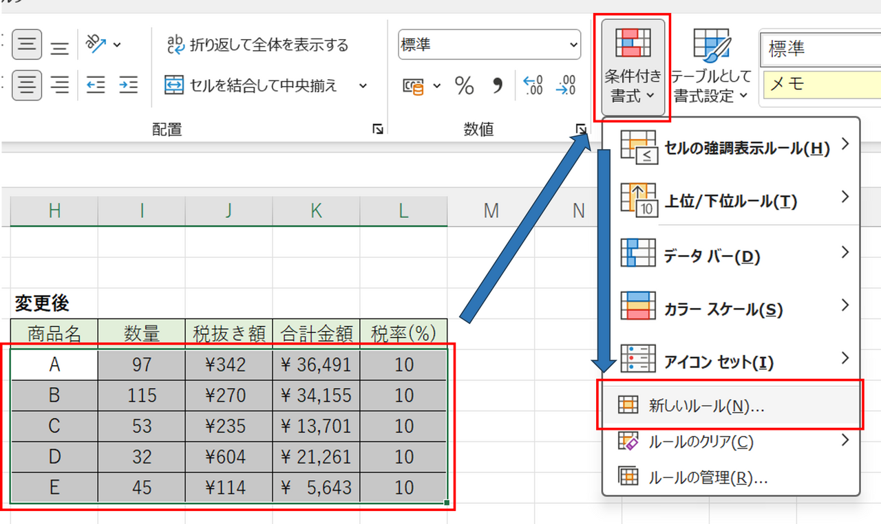 ②差分を確認したいほうのセルをすべて選択し、ホームタブの「条件付き書式」より「新しいルール」を選択します。