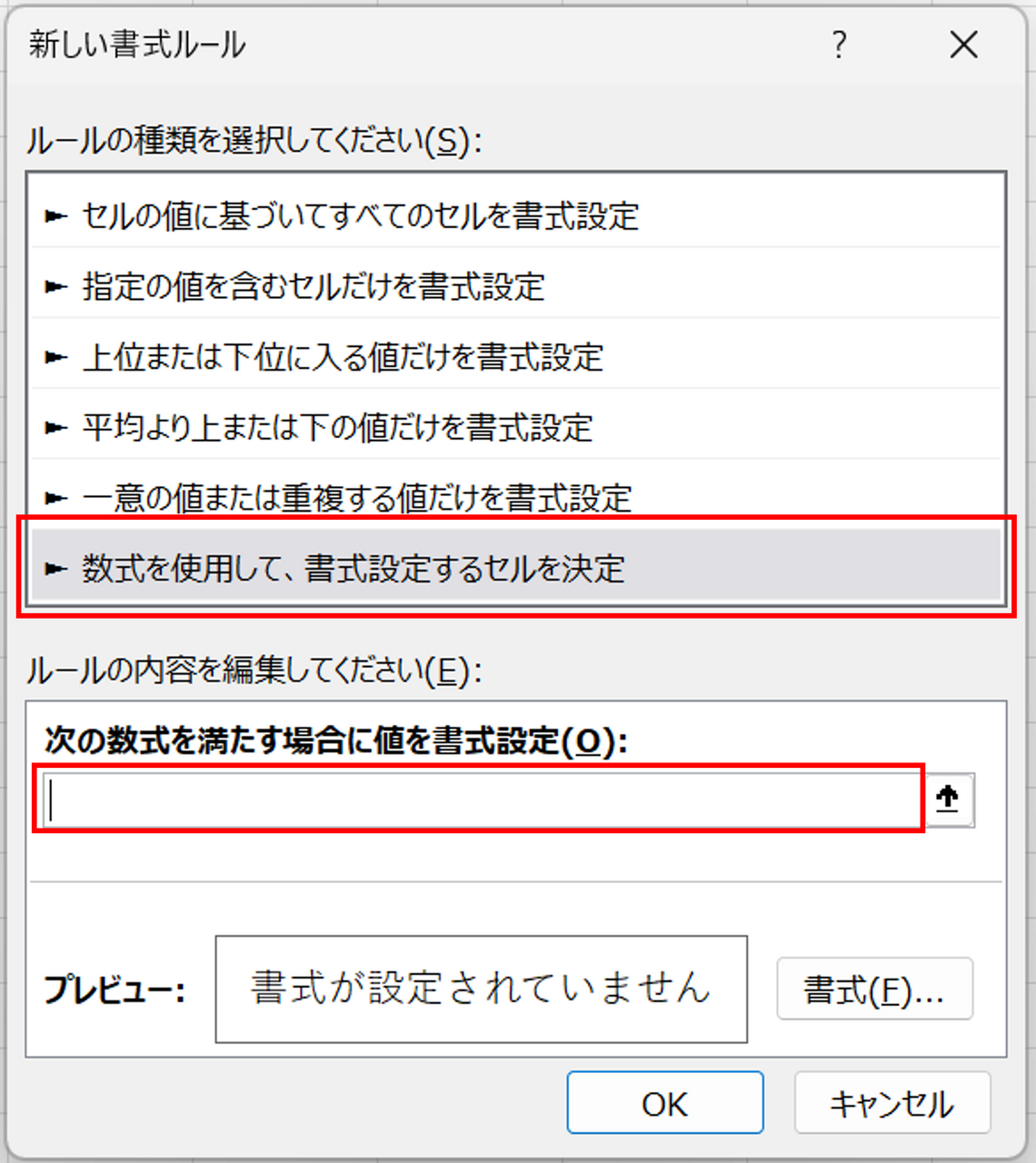 ③開いた新しい書式ルールから「数式を使用して、書式を設定するセルを決定」を選択します。