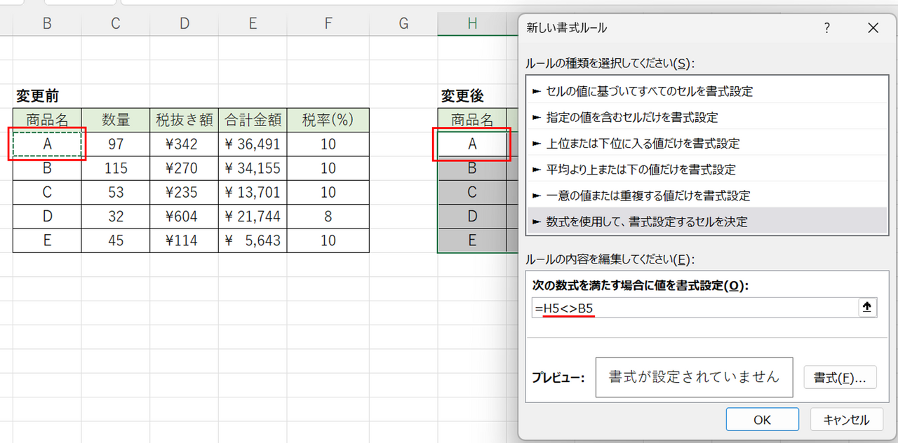 ④「次の数式を満たす場合に値を書式設定」の欄に、比較したい表同士の一番左上のセル名を「<>」で挟んだもの入力します。