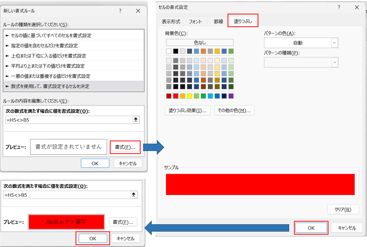 ⑤「書式」からセルの書式設定を開き「塗りつぶし」タブで差分として変わる色を選択して「OK」を選択し