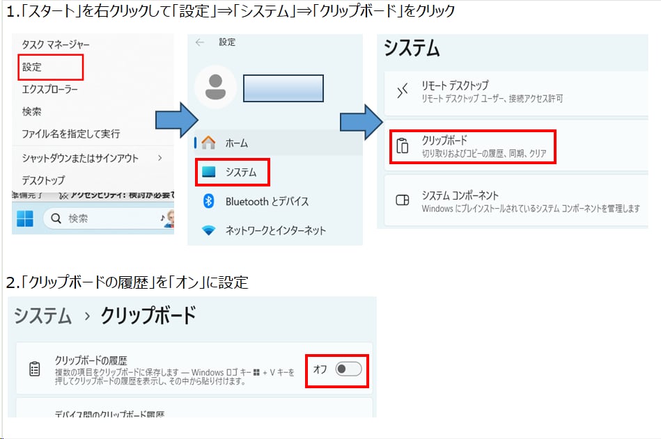 Windows 11では、この機能が初期設定で無効になっているため利用する際には「設定」→「システム」→「クリップボード」から「クリップボードの履歴」をオンにする必要があります。